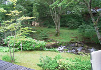 ホテルへ移動。庭に面した部屋から外にでると小川が流れ、せせらぎがよく聞こえます。山の向きのせいか陽が差し込まないようで、しっとり、苔もたくさん生えています。那須ではこの時期まだ紫陽花が見られます。かなり広めの敷地で散策探検。