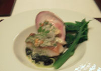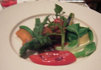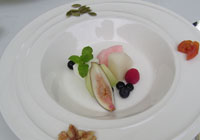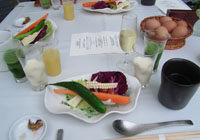 おはようございます。朝食です。小川を見ながらテラスでいただきます。8時から、一番乗り。気持ちよい。まず黒豆茶。