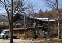 ル・ラシュでお茶。玄関、左手がレストラン。宿泊棟は裏手の山斜面のよう。建物前の庭。この風景を見ながらお茶できるはず!が、曇りガラスで見えるはずの景色が見えない。