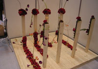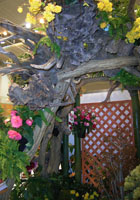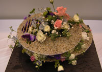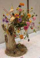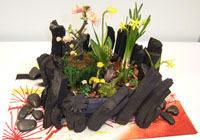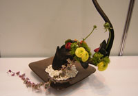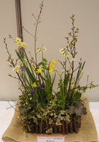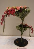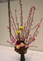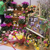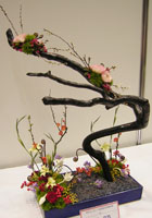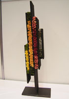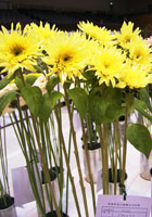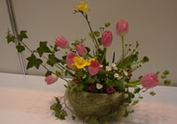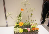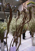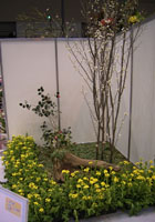 フラワーアレンジメント、花卉業者の花が、金賞、銀賞、銅賞とランクづけされて並びます。花フェスタのシンボル的オブジェ。春そのものの菜の花が絵のようにはめ込まれています。菜の花の香りがあたりに漂います。(私はあまり菜の花の香りがわからずKさん気づく。)
