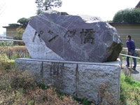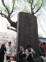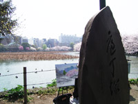 池の湖岸に桜並木。そして包丁塚は調理師組合、鳥塚は焼き鳥組合が建てたものらしい。(中央写真クリック拡大) |