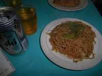 焼きそばを作っているお店、何かひかれる。行き過ぎて、戻って入店。実はメニューは焼きそば350円(並)とおにぎり100円のみ。甘味なし。飲み物はほぼコンビニプライス。具はキャベツだけのさっぱり焼きそば。元気なおばちゃんが給仕してくれ、下町情報を教えてくださる。有料のガイドブックを持っていると、びっくりしていました。そんなこと言ったって。アサヒビール本社に映るスカイツリーが人気と伺う。 |