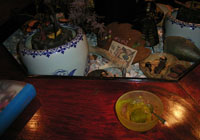 おかみさんが帰ってきました。リュウくんの話、薬酒の話、山の話を聞きます。右端の写真はハマナス。その他、ところ狭しと並んでいます。
