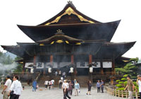 国宝善光寺本堂は宝永4年(1707年)に再建され、江戸時代中期を代表する仏教建築として国宝に指定されている。間口24m、高さ30m、奥行き54mという壮大な伽藍は東日本最大で、最奥部にある仏堂の手前に広大な礼堂(らいどう)を繋ぐ棟の形が、鐘を叩く撞木(T字型)に似ていることから「撞木造り(しゅくもくづくり)」と呼ばれている。裳階(もこし)を廻らせた二重屋根は総檜皮(ひわだ)葺きとして日本一の規模を誇る。