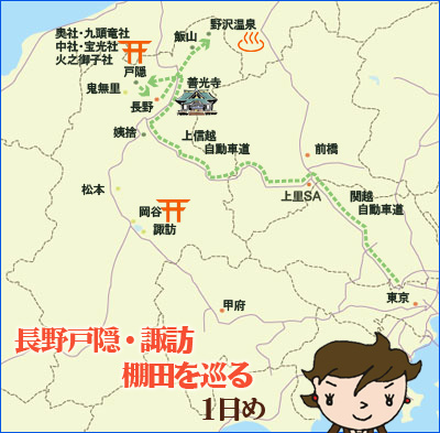 この頃はまっている長野への旅です。今回は戸隠神社、諏訪神社、そしてどこか棚田を見られたらいいなと出発です。今回の宿は、食事の取り回し鉢で訪ねてたかった野沢温泉の旅館に泊まります。