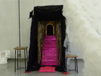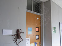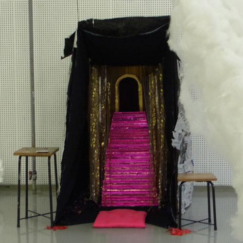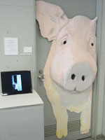 ドアに巨大な豚。隣の台には防犯カメラのようなどこかの映像。展示作品と共に、学生の作成風景も見ることができます。