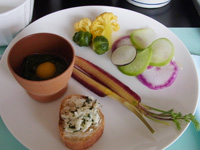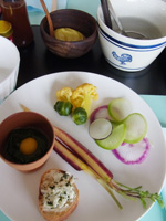 コースです。前菜は塩麹マヨネーズ鎌倉野菜、メカブ、ワカメバターフランスパン。
