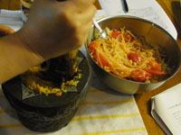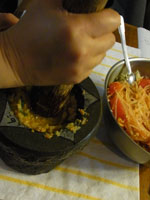大好きなソムタム。クロックはほぼ私の持っているのと同じ。これまでマジックで書かれた数字をいたずら書きと思っていましたが、どうやら大きさを示すものとわかりました。ソムタムの千切りは、沖縄のにんじんシリシリ用で切っているとのこと。