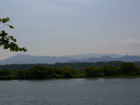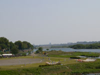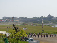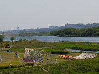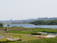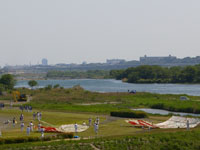 会場近くに到着。相模川治水の様子。会場が見えてきた!凧に比べて人が小さい。