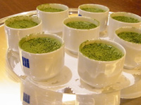 デザートはホワイトチョコレートと水を混ぜ合わせた抹茶味のもの。コーヒーと。器は日本酒を飲む猪口です。TBSおめざにも登場したものとのこと。残念ながら退座です。 |