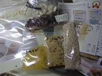 本日のお土産、雑穀いろいろ、豆いろいろ。雑穀協会から雑穀レシピ付きカレンダーも。 |