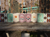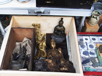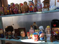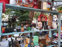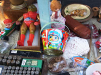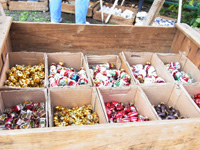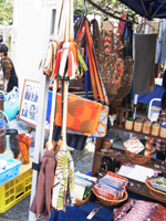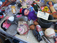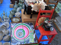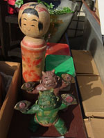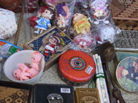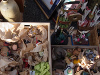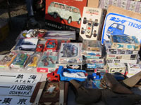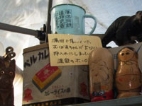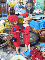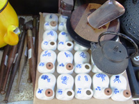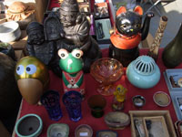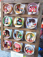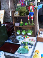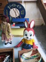写真左かえるがたくさん、 写真中央棚上段右側の琺瑯ボウル赤白黄色はサイズが大中小。小でも1200円します。写真右、プラスチック福引のガラガラがかわいい。
