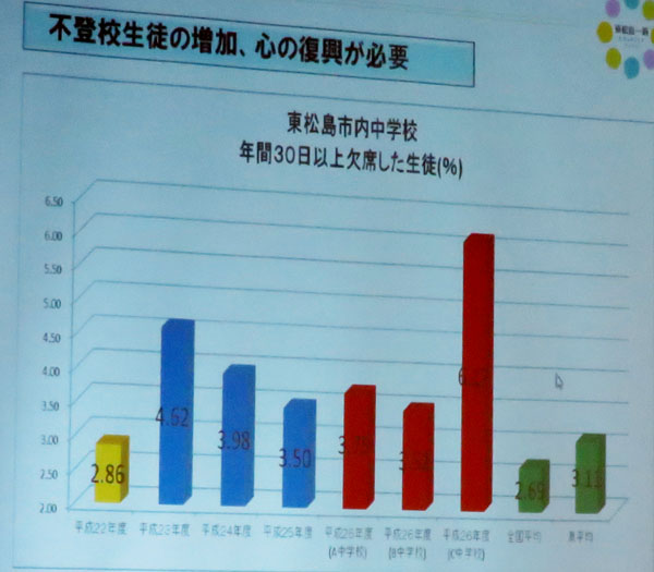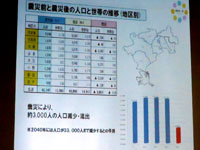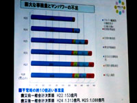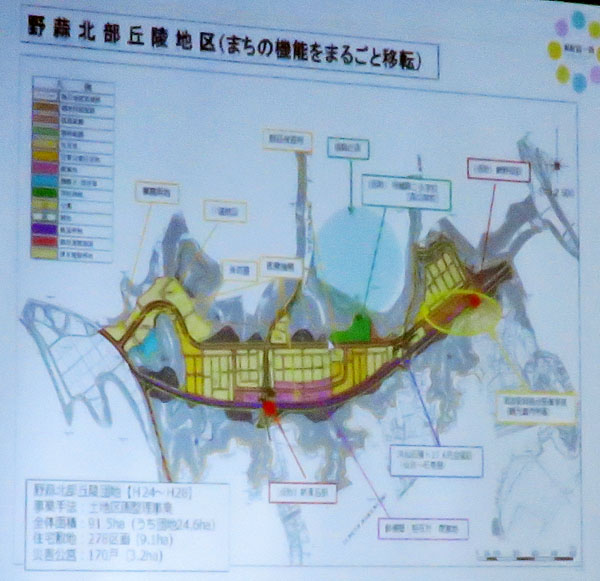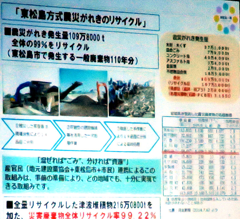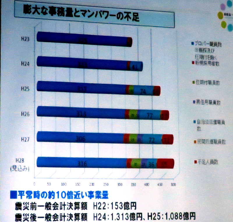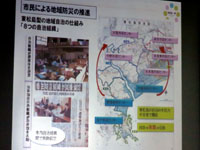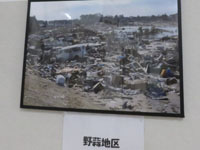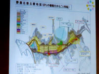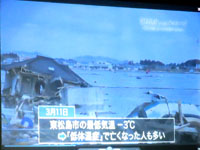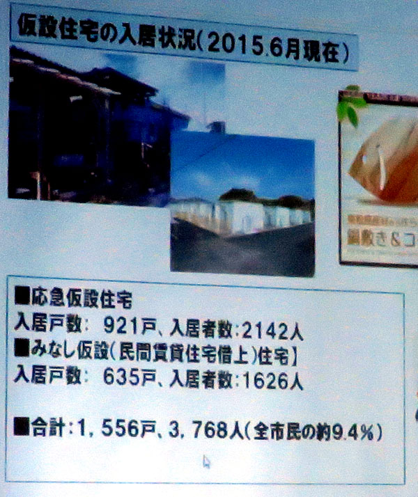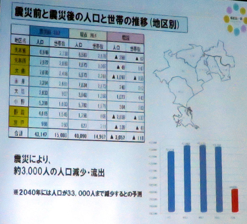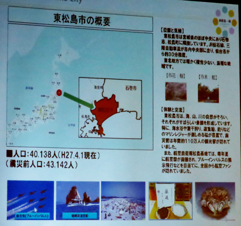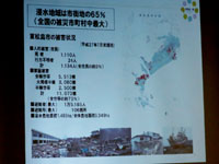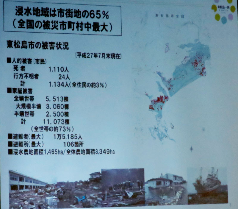 | 市役所に移動し、震災・復興の話を聞きます。東松島市では65%が浸水し1110人死亡、低体温で亡くなった方も。 |