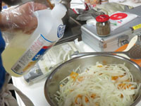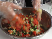 キュウリ、トマト、タマネギを塩で和えます。