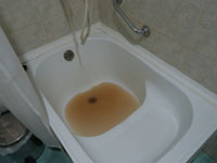バスタブが付いている。お湯を流すとしばらく赤色。これではシャワーも浴びられず、しばらく流していると透明になりほっとする。