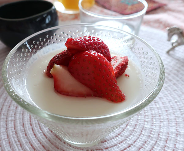 デザートのイチゴ杏仁豆腐、イチゴはそのまま、マリネ、ドライ3種