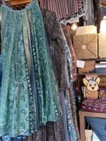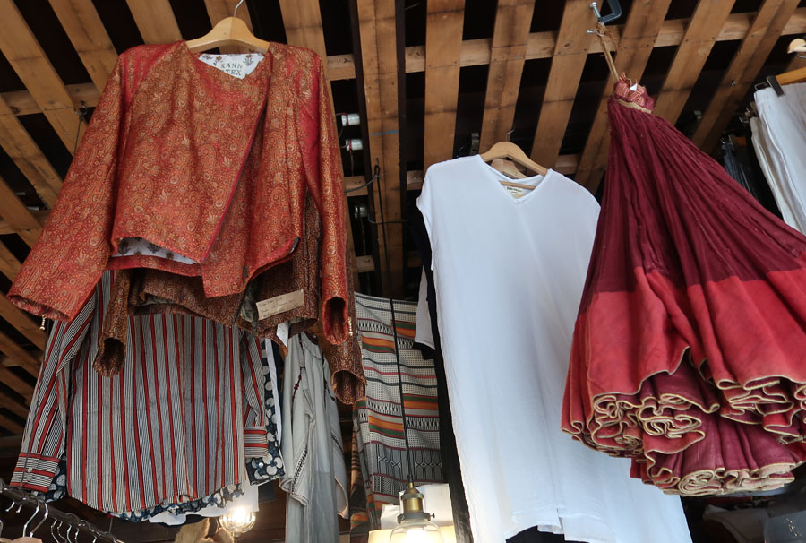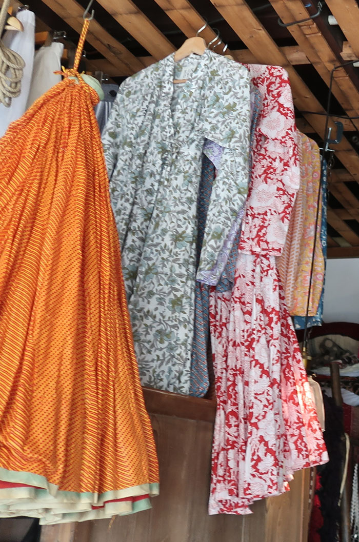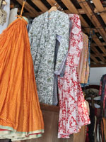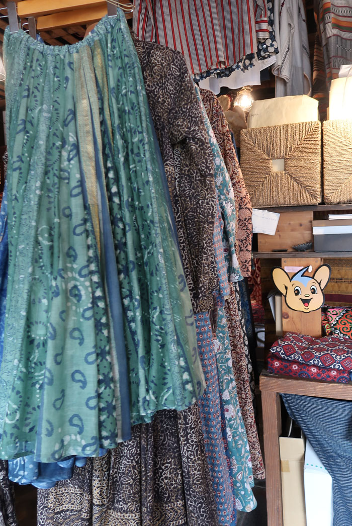 インドグジャラート等で買ってきた布をこちらのスタッフが縫う。縫製が丁寧。ほつれた部分はロックミシンでは無く袋縫いで内側に入れている。スカート、ワンピ―スのスカート部分は40ハギ。畏れ入ります。都心でも展示会あり。