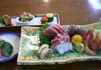 この日のランチは、早川漁港の市場の中のお店の三種丼です。でも四種丼(鮪の漬け、甘エビ、鯵、ホタテ)です。イルカも勧められましたが、ちょっと…ですね。 |