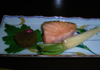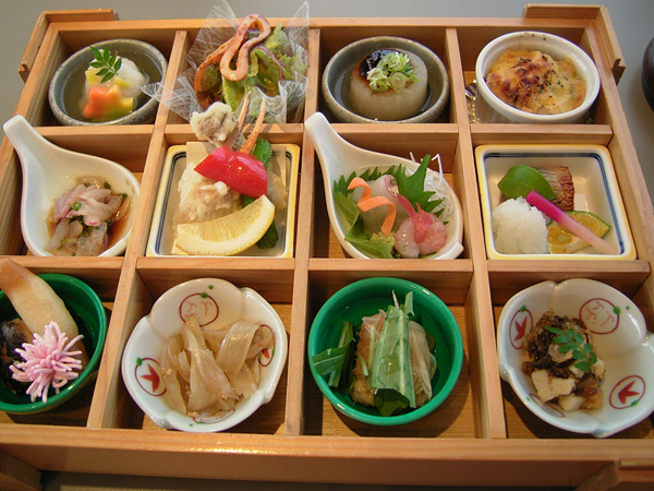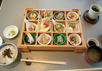 ホテルに戻り8階の浅田屋へ。宿泊のホテルに浅田屋があったというのに行かないのは後悔しそう。華ご膳2800円です。12種のごちそう。金沢風?京風?えびしんじょう入りミニ春巻き、うどの金平、お造り、天ぷら、きのこグラタン、ふろふき大根、里芋饅頭など。