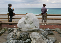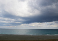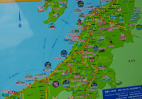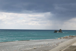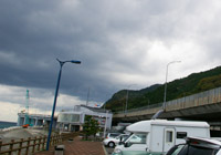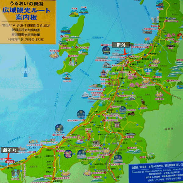 | 今日は金沢に向かって走ります。まず上信越自動車道で新潟方面へ。昨夜かなり雨が降りましたが、朝になると快晴。しかし日本海側に出るにしたがい黒い雲が空をところどころ覆い、それが切れると晴れ間も射し、高速道をまたぐように大きな虹がかかります。ただウレシイ。途中親不知(おやしらず)へ。こちらはいったん高速道を降り、親不知ピアパークへ。 |
