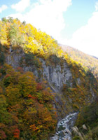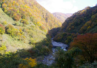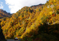 片道3150円。帰宅するためにも通行は必須です。片道1車線、駐車場があり、きれいな景色が広がると停車すること十数回。観光バスもかなり行き交います。山肌を緑、黄色、赤に染め、滝が流れ、峡谷美と空の青さの競演です。石川県側から入るとちょうど左側に駐車場があることが多く、運転が楽です。