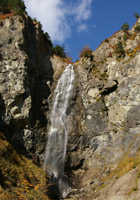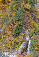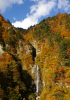 ↑「『ふくべの大滝』国見谷の断崖より約86mの落差を持つ蛇谷第1の大滝で、時にはその水しぶきが進路をおおうこともある。蛇谷金襴銀襴壁とよばれ、その絶壁が見事である。」