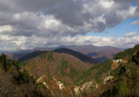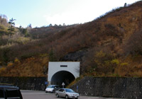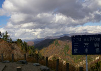 トンネルをくぐり、岐阜県側へ。三方岩です。これまでの景色が一変し、彩りのある山から枯れ木の山が連なる風景になります。