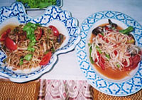テストの3品です。汁そば、ソムタム、寒天です。OKをいただきました。 私のソムタムはプリックのつぶし過ぎで全体の色が悪いです。タイ人が作ると右のようにパパイヤが白いです。