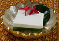東北料理です。 ココナッツミルクとバイトイの2層の寒天です。緑の層はバイトイ(菖蒲の葉っぱのようなもの)から抽出した色・成分。 かぼちゃのプディングです。材料は卵液、ココナッツミルク、かぼちゃを細かく切ったもの、パームシュガーなど。