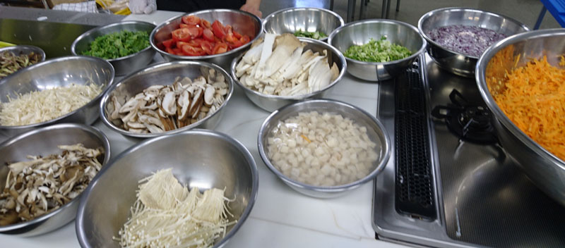 ほぼ下準備は終わっていました。6時食事開始なので、まだまだです。結局、食事開始は5時半過ぎ。ずっと立ちっぱなしは疲れる〜。 |