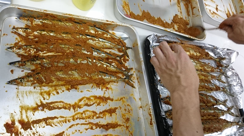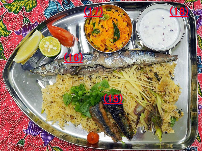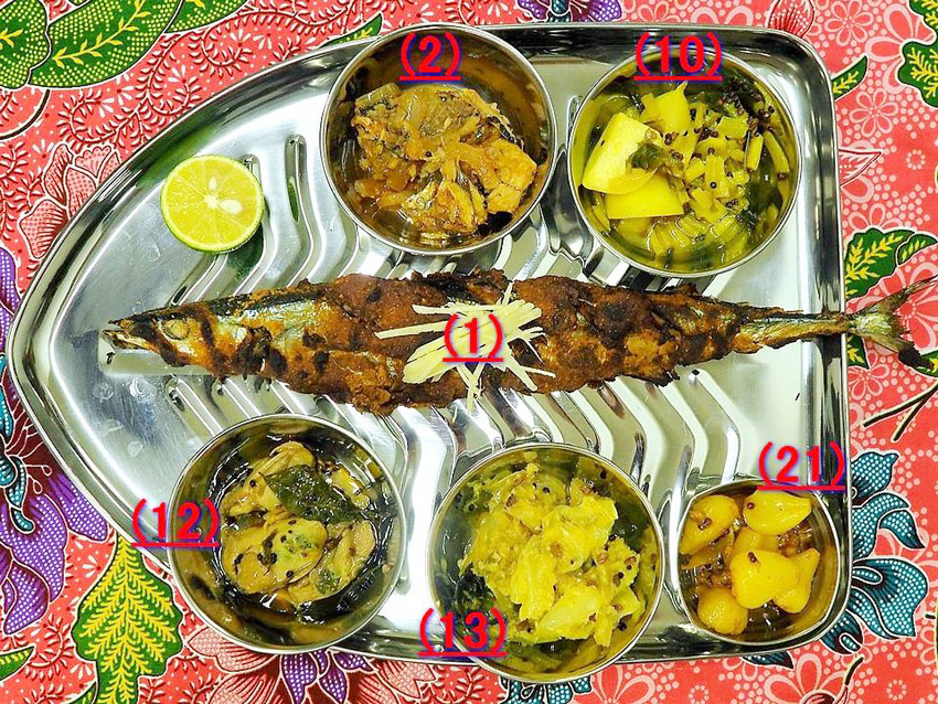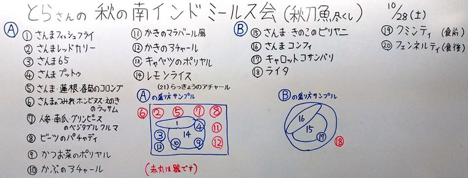 @サンマフィッシュフライ、Aサンマレッドカリー、Bサンマ65、Cサンマプットゥ、Dサンマ・蓮根・春菊のコロンブ、Eサンマのつみれ・ホンビヌス・えのきのラッサム、Fニンジン・南瓜・グリンピースのベジタブルクルマ、Gビーツのパチャディ、Hかつお菜のポリヤル、Iかぶのアチャール、Jかきのマラバール風、Kかきのアチャール、Lキャベツのポリヤル、Mレモンライス、 Nサンマ・きのこのビリヤニ、Oサンマコンフィ、Pキャロットサンバリ、Qライタ、21らっきょうのアチャール |