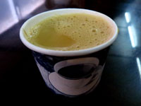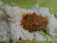 ラッサムがきたが、私たちのテーブルは残りの汁のみで、隣のテーブルには骨付きチキン入り