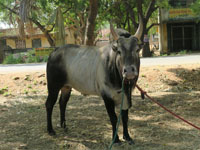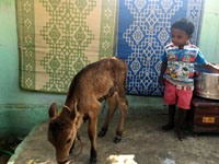 小さな子が付きっきりで仔牛そばに (日本だったら、よそ者がわんさか現れたら、これくらいの小さな子、何かされないかと見張るものだけれど)