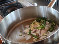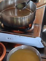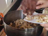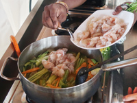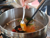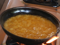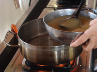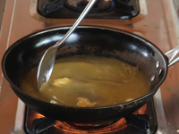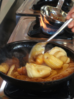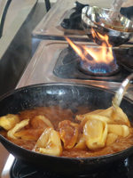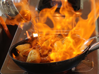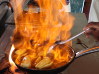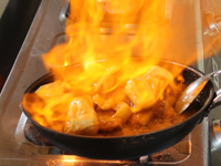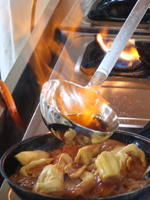 隣のコンロでは、おたまにコニャック入れ火をつける