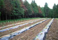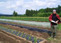 恵まれている土地(一部の畑の場所には鶏糞残滓場所だったとか。)のようで、今のところ化学肥料なしに野菜を育てているらしい。反対側にネギが植えられていたが撮影し忘れた。ネギは連作中。 |
