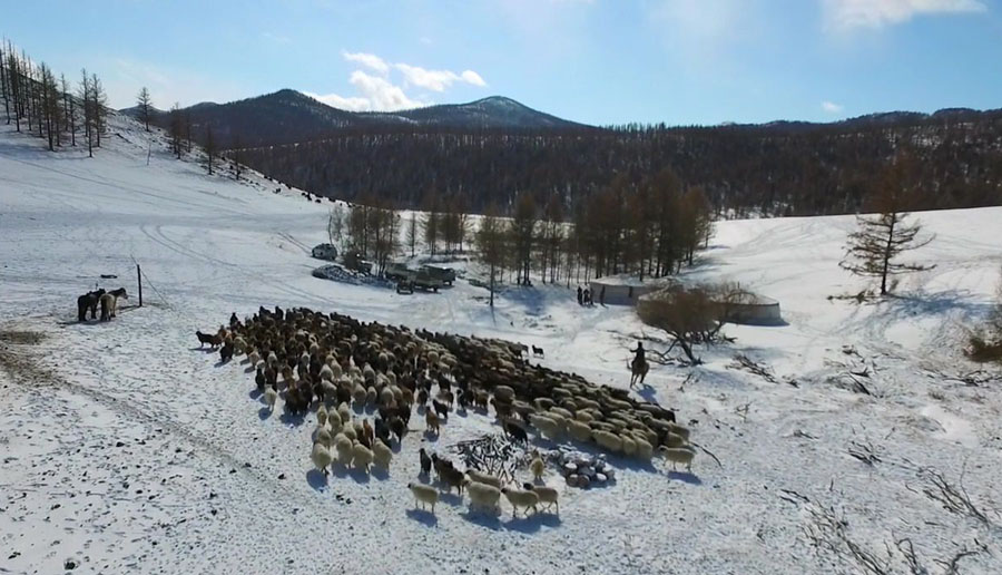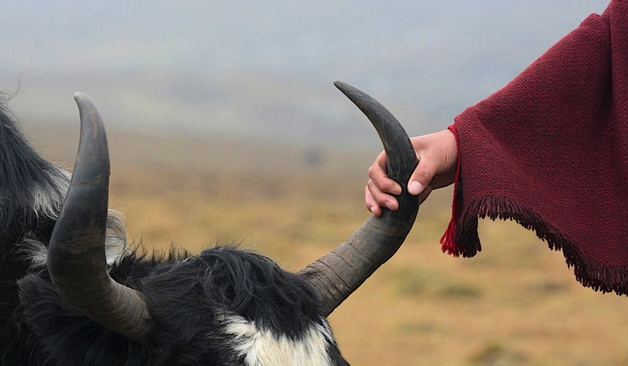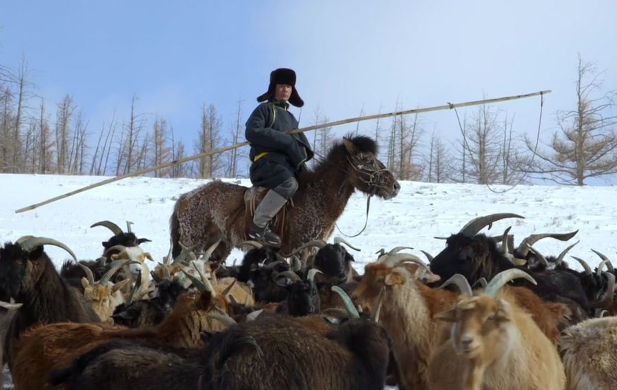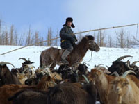 モンゴルで刈り取られたカシミヤはネパールで織られる。ドイツ人のクリストファーはモンゴル人を妻と結婚し、今回は11歳の娘を連れ、モンゴルを訪ねる。ブリーダーのモトとは20年来の付き合い。カラコルム、-50℃のカシミヤ山羊。カシミヤのランクA〜D、とにかく質にこだわる。ネパールに送られたカシミア、糸飛びを一つ一つ直していく作業。冬期は薪も無くなり動物の糞が薪代わりになる生活。 |