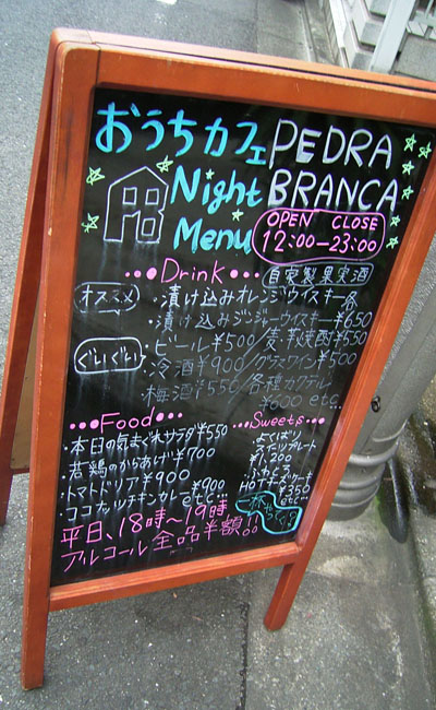 近くのカフェは元医院を改装したもの。飲み物半額に反応強いが、平日のみでした。時間もないので外観だけ見る。PEDRA BRANCAって、白い何?看板クリックで拡大。
