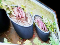 鉢でサツマイモ、ナスがたくさん実をつける