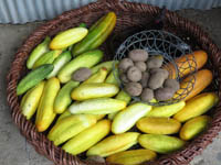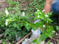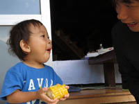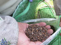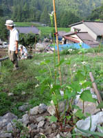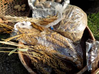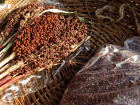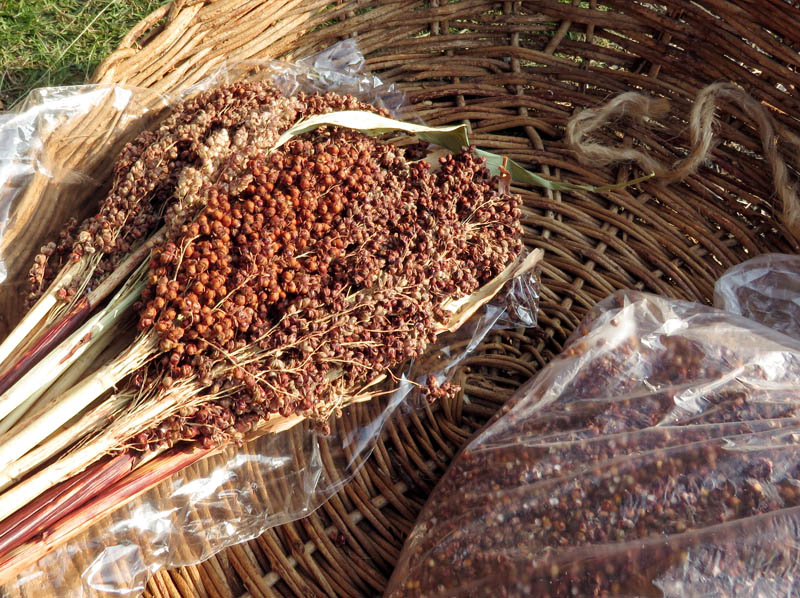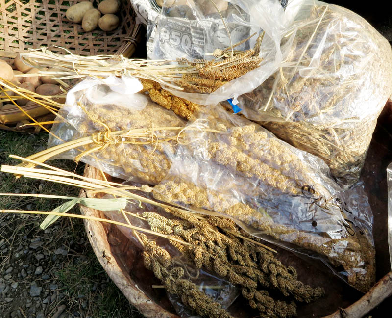 ネコアシは帆の先がネコの足のように枝分かれしていることから。モチ種のアワ。シロモチは、実がたくさんなるが、皮が厚く、脱穀すると収量少なく、ジーヨロコビノバーナカセ(爺喜びの婆泣かせ)といわれる。味はよく、モチ種のアワ。