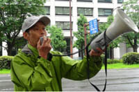 借地に新築の家を建てたら、更新して土地を借りれられなくなり、家を失う。裁判に疑いを持ち、戦いはじめる。突き抜けている。裁判で撮影を禁じられ、傍聴に携帯電話の持ち込みを禁じられる。退出を命じられ、係員たちから追い出され、その時のケガから救急車を呼び、病院へ。診断書を基に被害者届を出すも、棄却。丸の内警察署前で訴えていたら、2週間前裁判所前で守衛に暴力をふるったと逮捕される。そのまま収監。本人不在のまま裁判は行われ、1年2か月の実刑。釈放後、最高裁正面玄関へ。そこは最高裁裁判官が黒塗り車で出入りするところで、下々のものは裏口から入る。そこでどうしても正面突破を狙う。そしてまた地道に裁判所前で活動。国民主権。 |