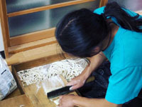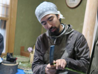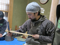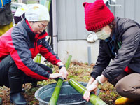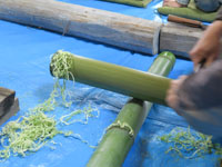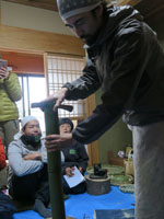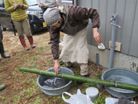 灰で竹を洗う、修行の時は籾殻で洗っていたが、金たわしが都合がよい |