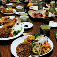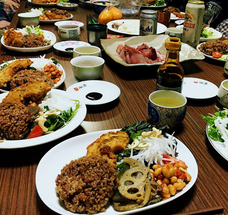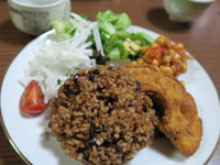 玄米、車麩フライ、大豆トマト煮、サラダ
