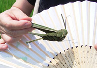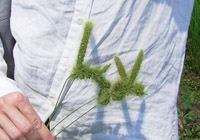 畦道のネコじゃらしを使って、ウサギができあがる。はたまた、バッタも。