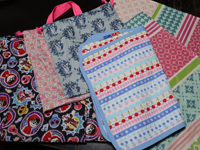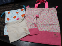 追加分、小学校使用のための防災頭巾入れ(リメンバーミーキルト生地、これは説明図がめちゃくちゃ幼稚で不明の中作る)、体操服袋丈詰め、給食着入れ、あっきーおむつ替えのための敷き、バスク(サンジャンドリュズ)で買ったダイニングシートでランチョンマットなど |