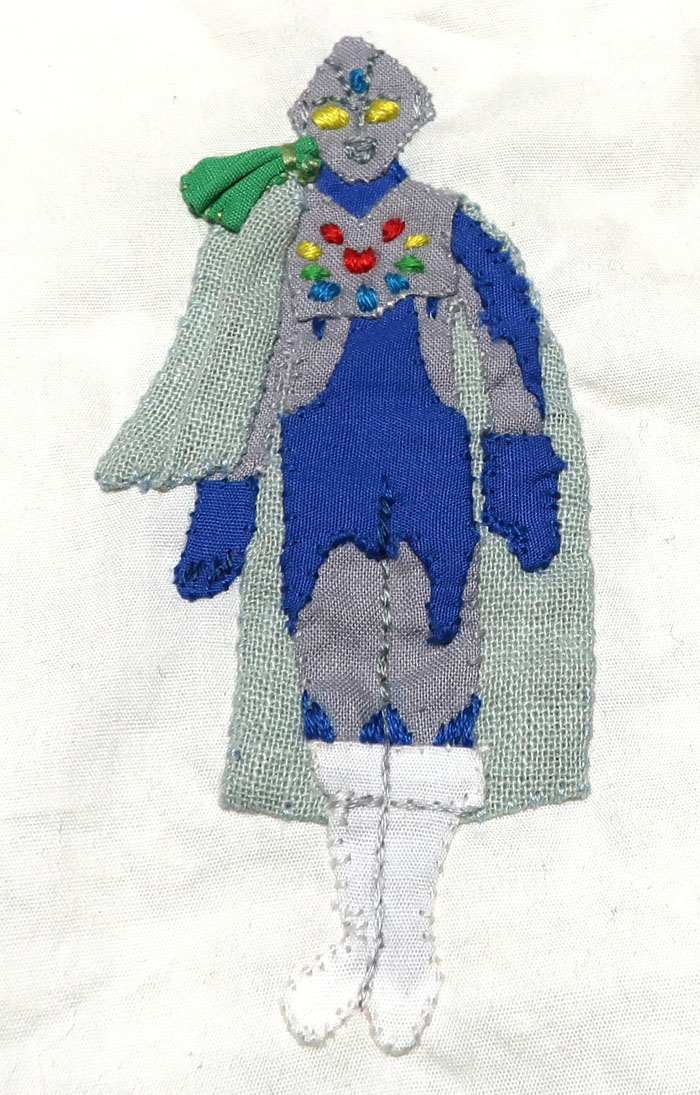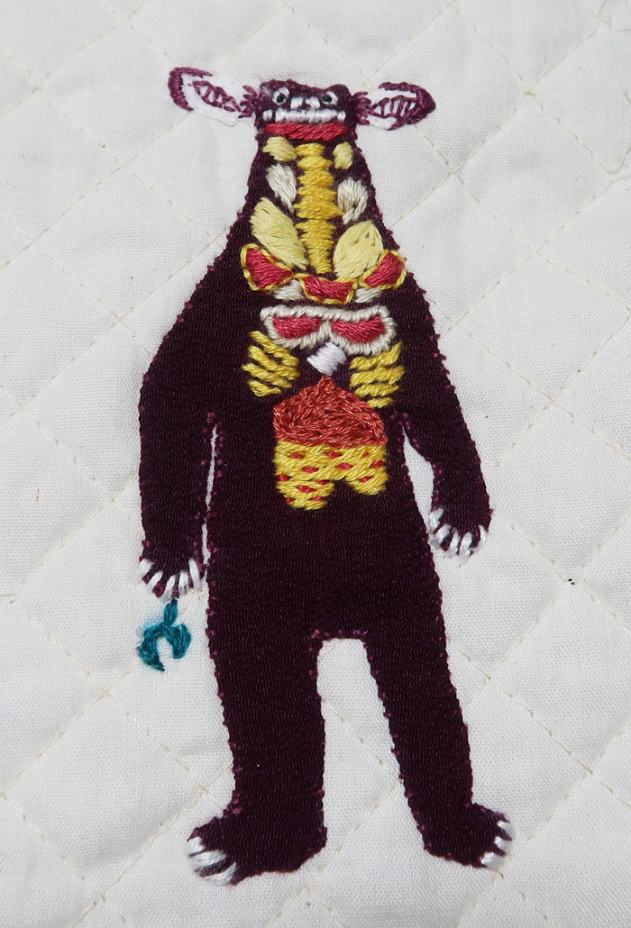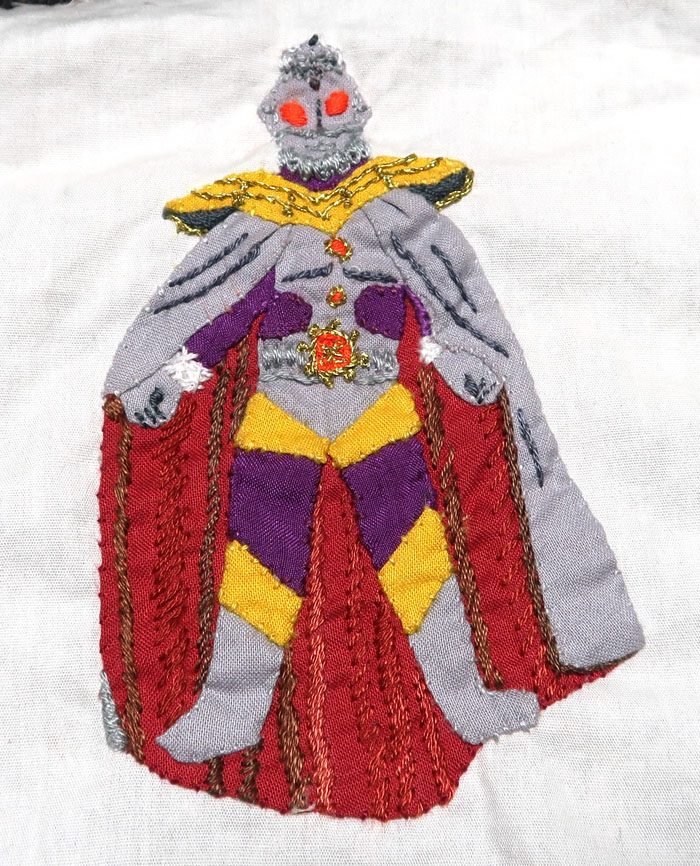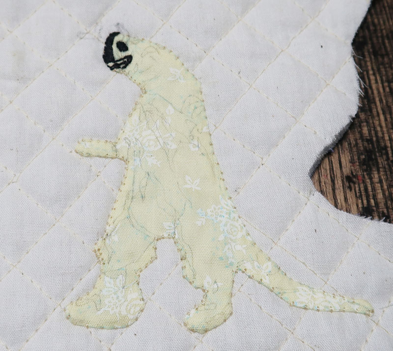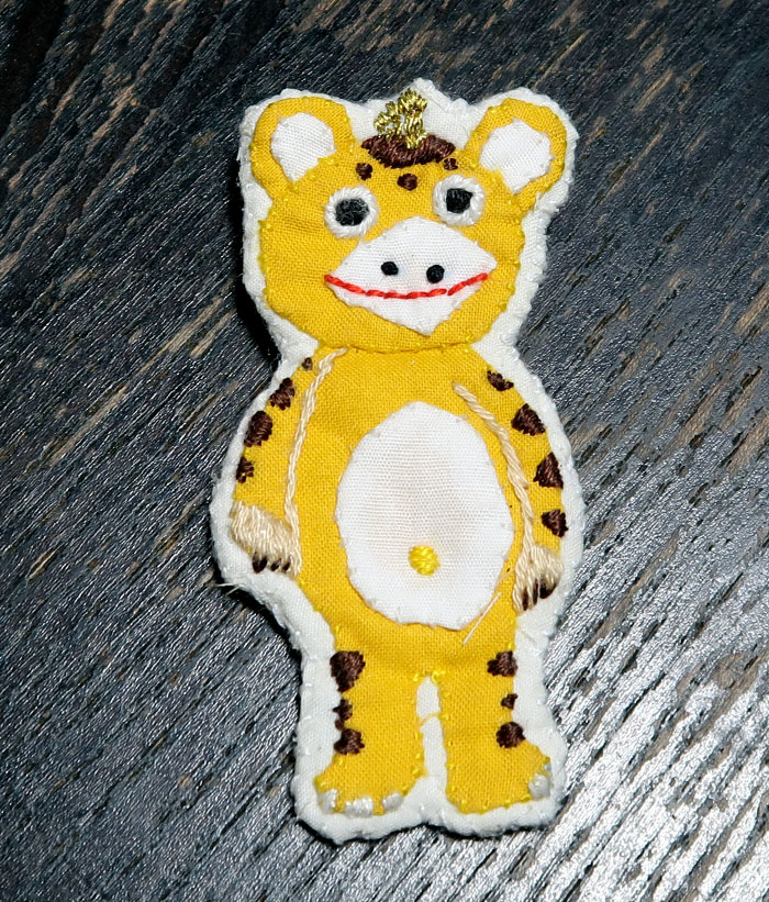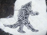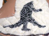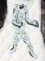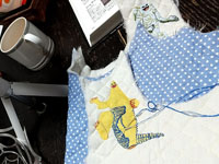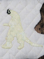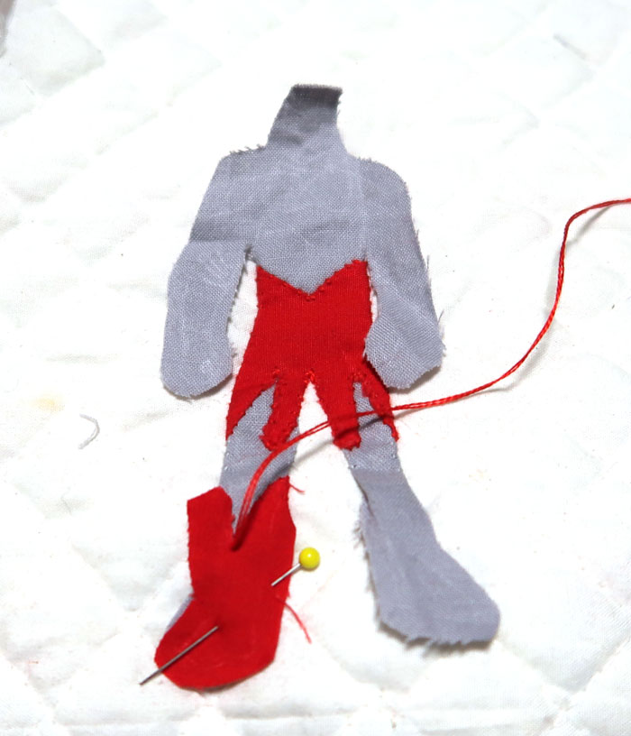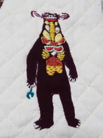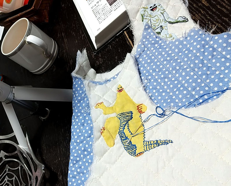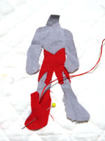 最初、体の部分を縫い付け、途中、手を置くスペースがないことに気付き、ほどき再縫い付け。 |