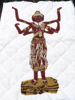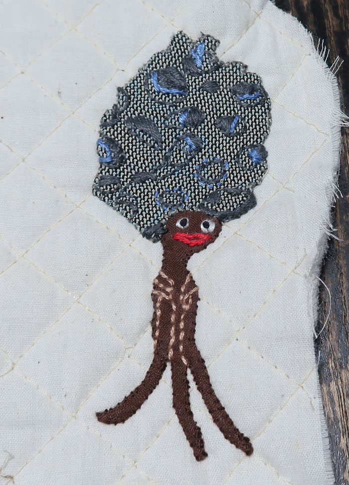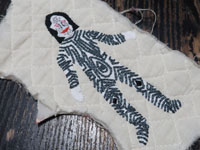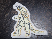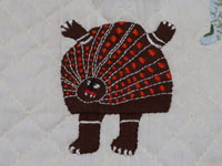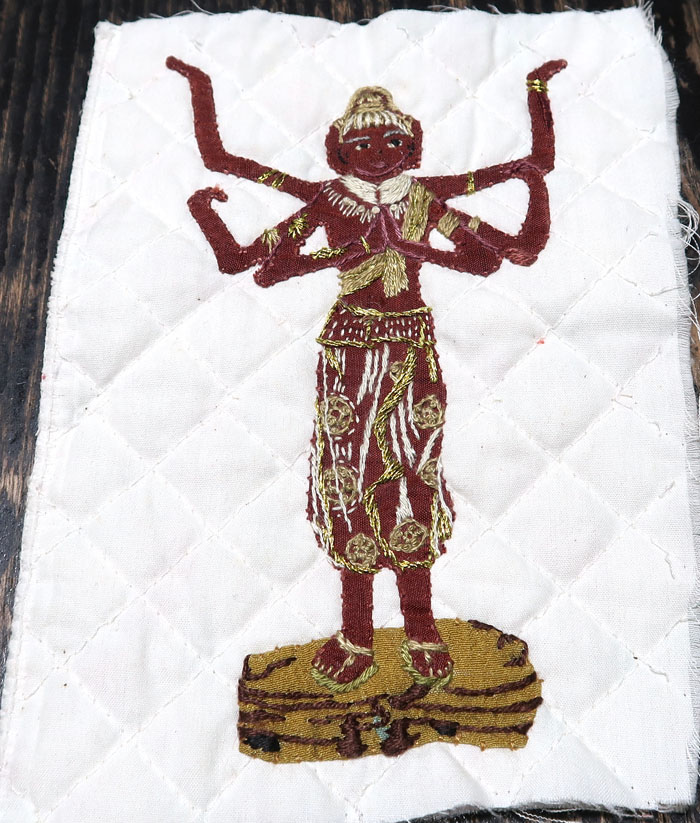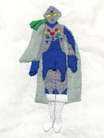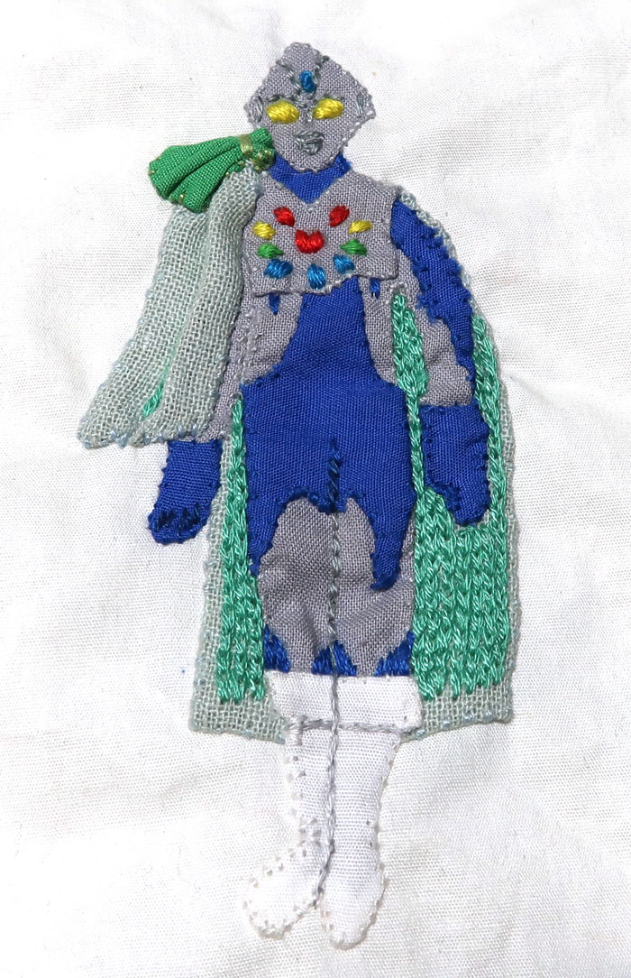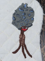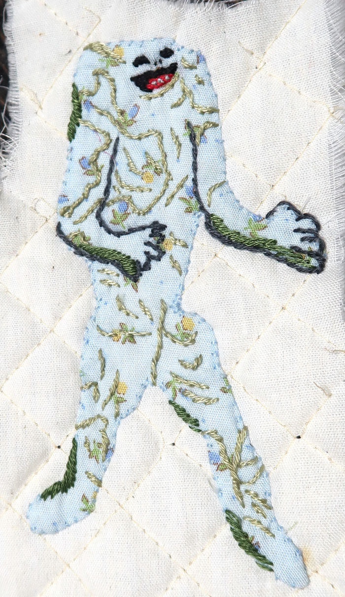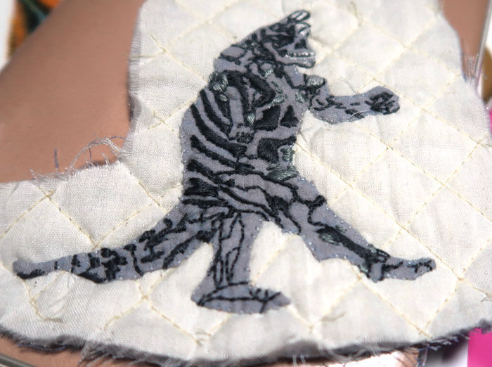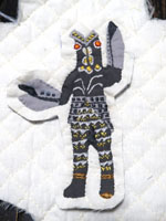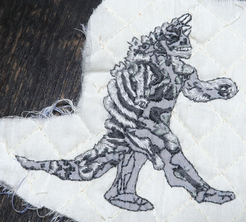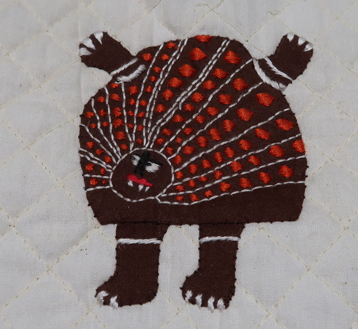 最初、体の部分を縫い付け、途中、手を置くスペースがないことに気付き、ほどき再縫い付け。 |