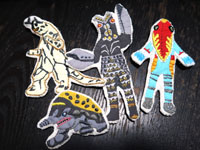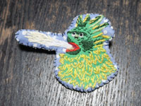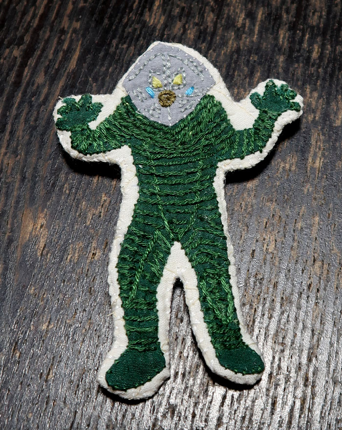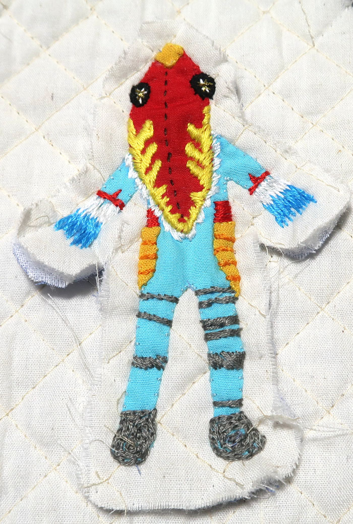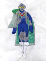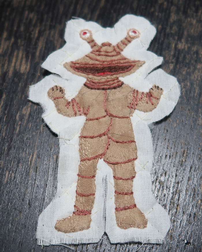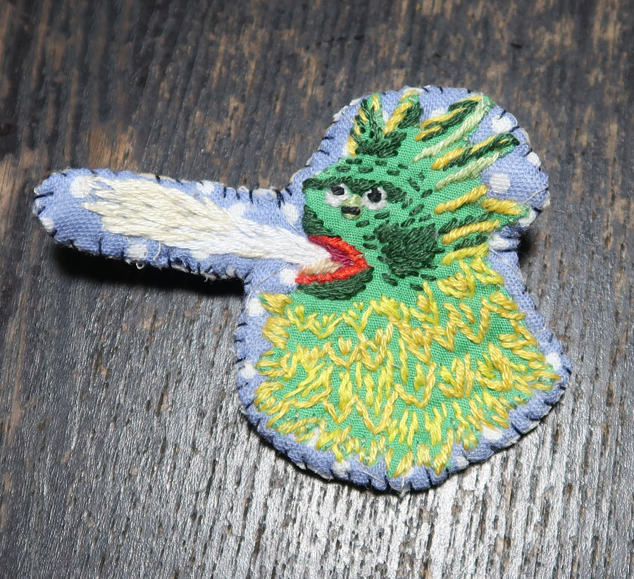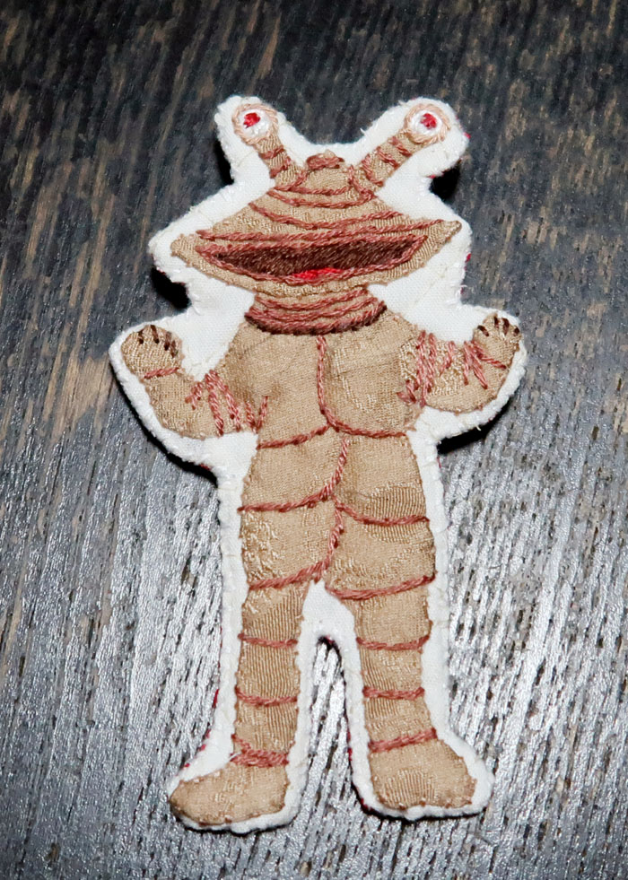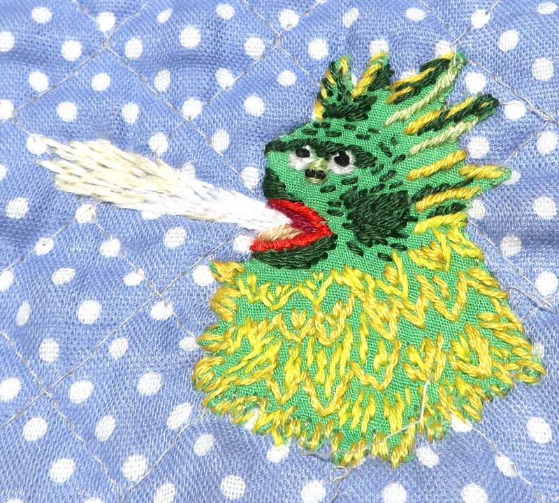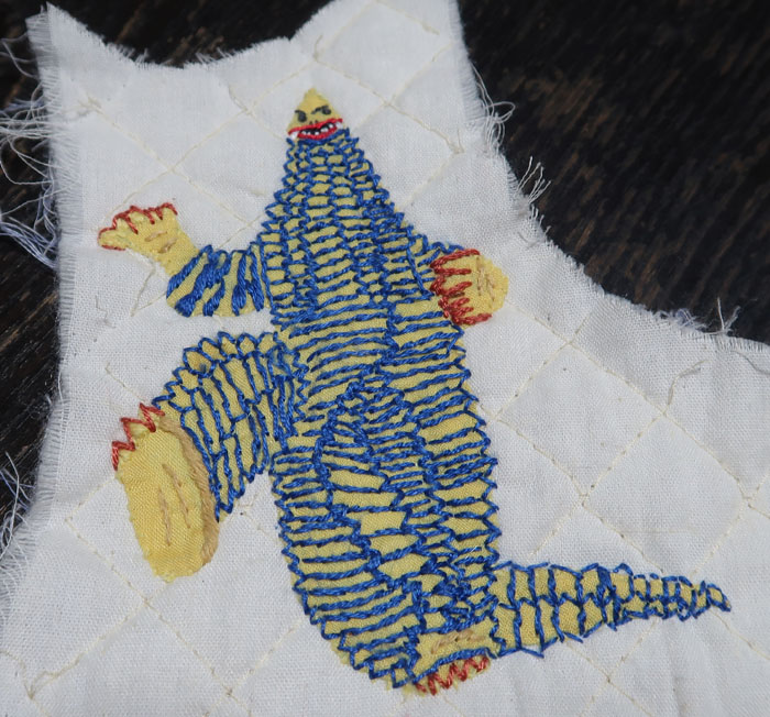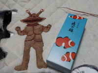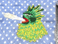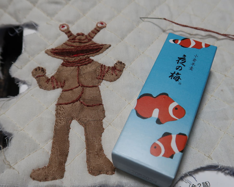 体の布を何色にするか、濃い紫の色のようだが、コットン系で紫色は皆無。着物地で探し、濃い紫を見つけたが、しわしわ縮緬(ちりめん)。ほつれやすそう。布地を持って刺繍も買いに行って、近い色の刺繍糸も手に入れた。縫い付けてみたらウロコっぽいからだの雰囲気出るし、ほつれ対応にできるだけ細かく針を入れた。かわいいのう。フック船長のような手先の鈎の糸は先日のpotetoさんのWSからの残り糸。 |