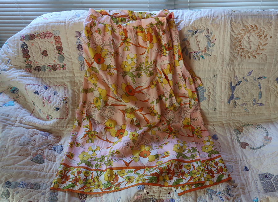 15年くらい前に横浜元町で購入のアメリカセコハンマキシマキスカート、長過ぎて未使用。裾に柄模様があるのでウエスト部分つけ替えし14cm詰める。