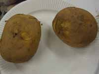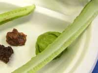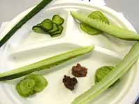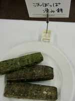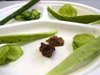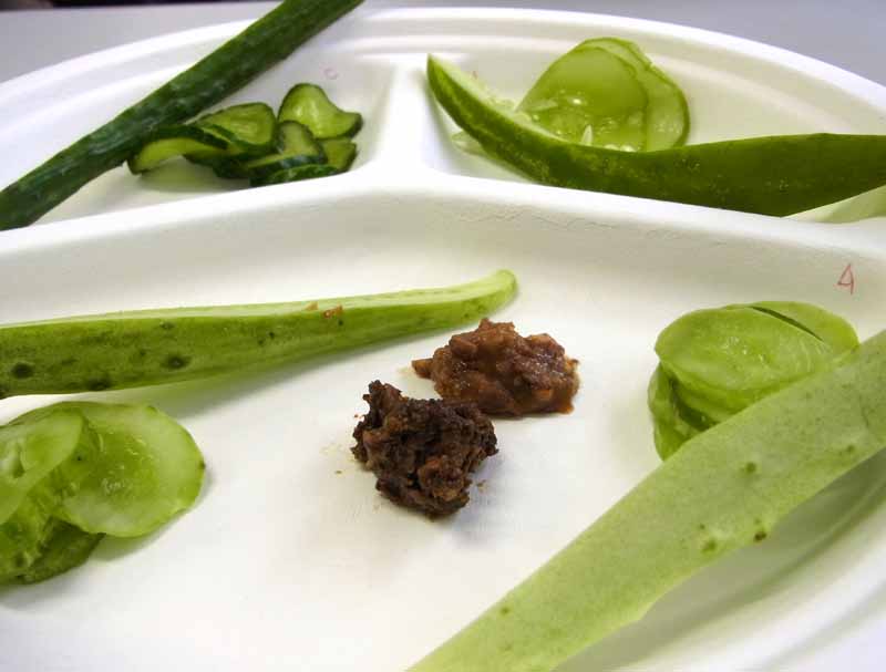 | <食べ比べ> 1%塩水に漬けたものと縦に切った生のものとを試食 |