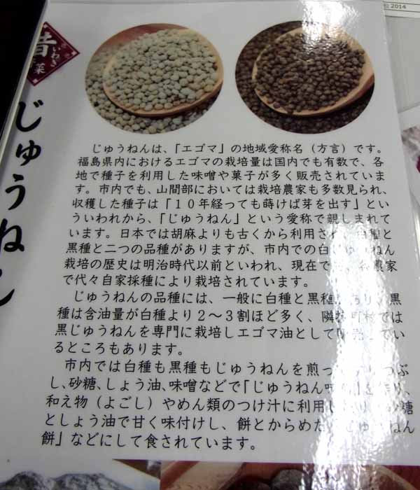 三和地区には「白蛇のたたり」という民話があり、白蛇をいじめた村人たちを止めに入った神主様が転び、ゴマの木で目をつつき失明。その後、悪天候、不作にみまわれ、白蛇のたたりと恐れた人々は、それを鎮めるためにゴマの栽培を絶ち、じゅうねん栽培が盛んになったといわれる。